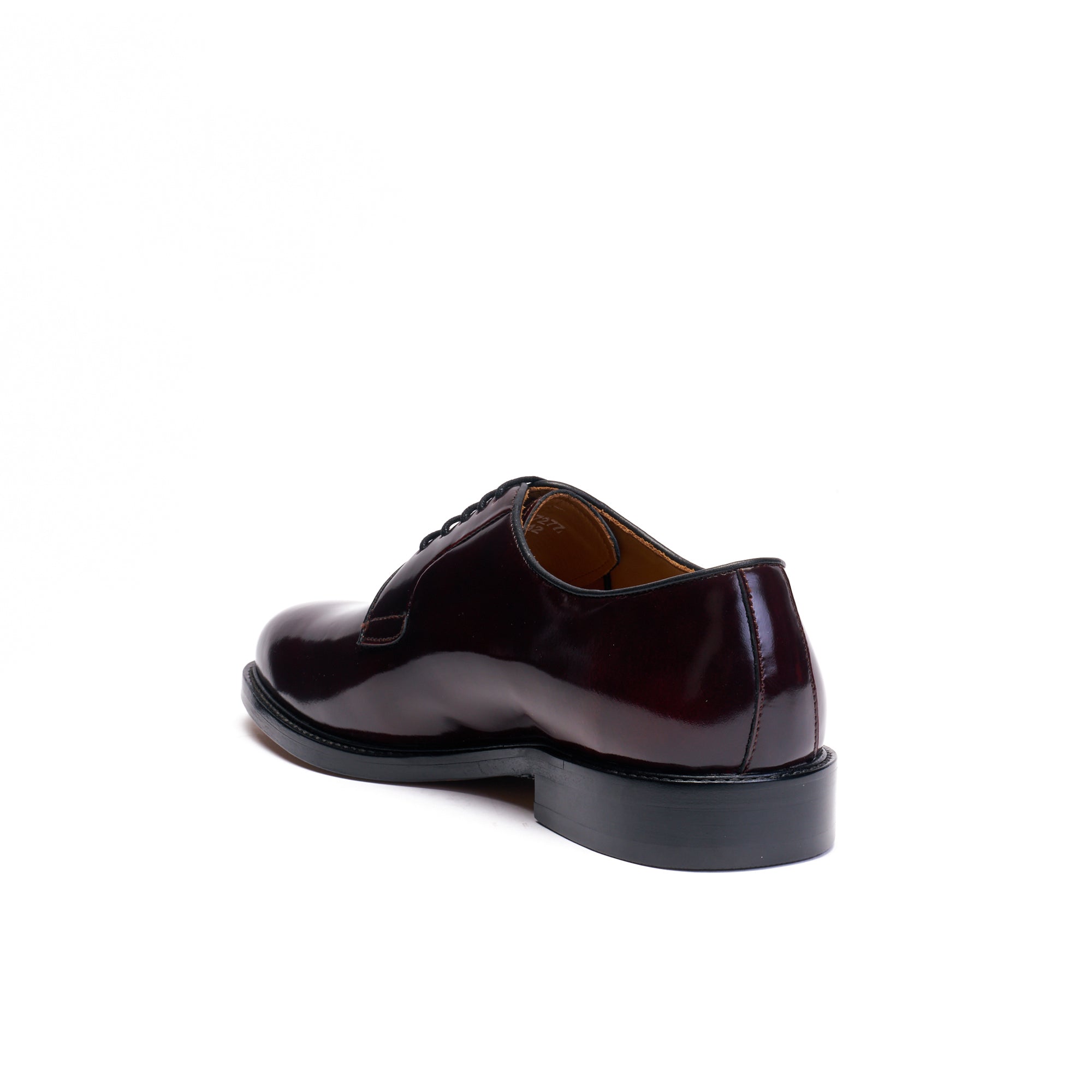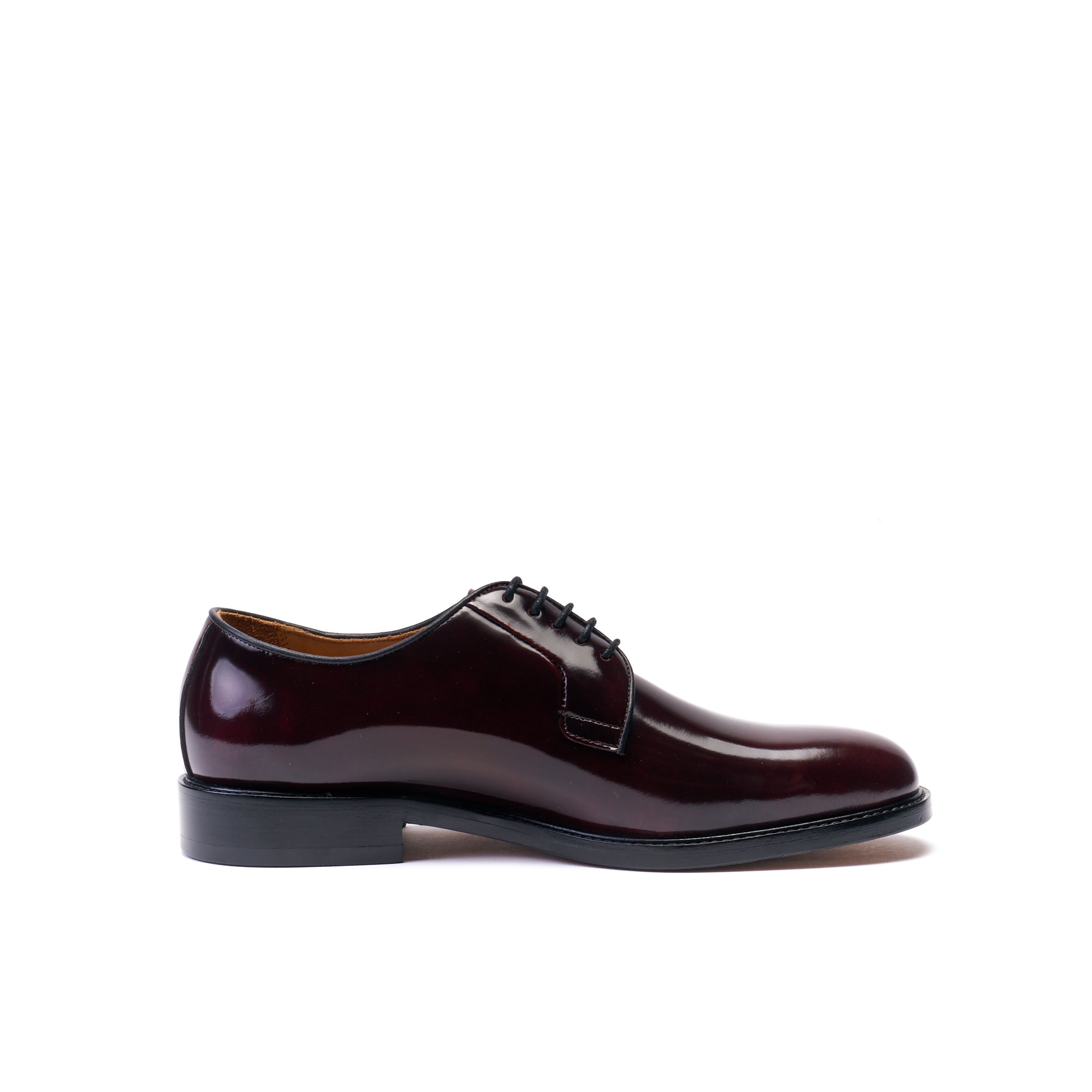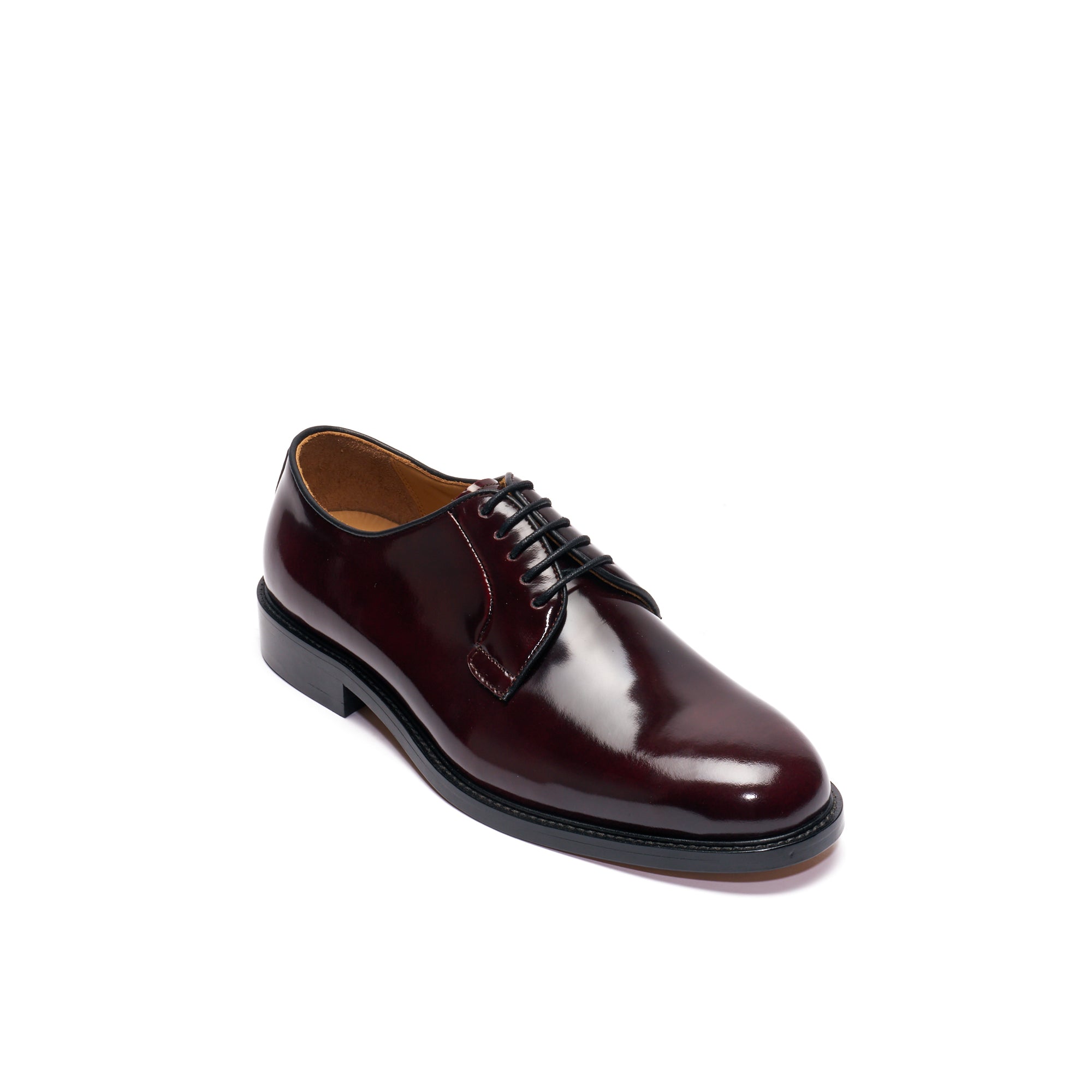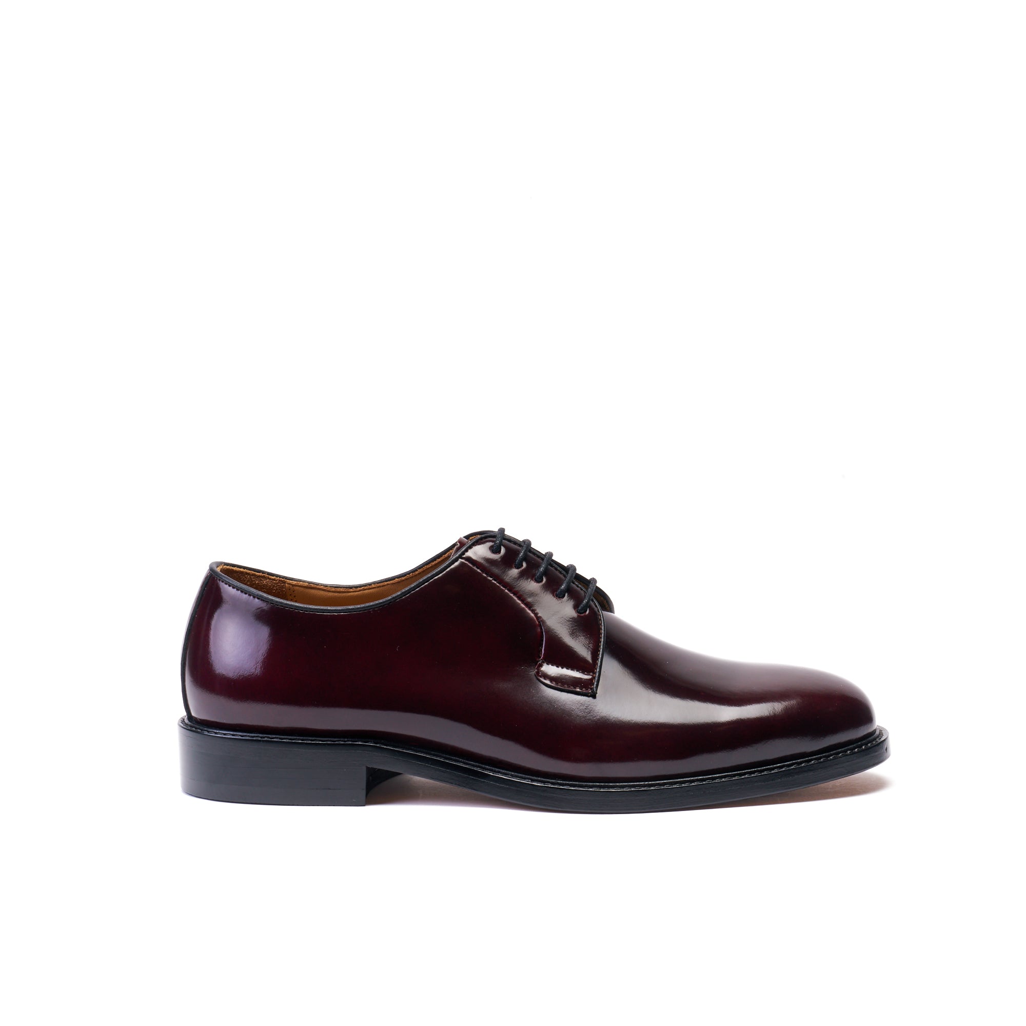 Derby à bout lisse réalisée en cuir de veau brun glacé de qualité avec semelle en cuir.